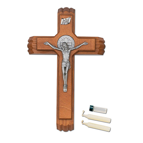This 13 inch tall walnut stained wood Saint Benedict wall crucifix has a silver corpus and Saint Benedict medal. This sick call set comes with two small candles and a glass holy water container.
