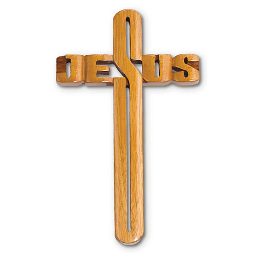 This 10 inch tall stained wood wall cross is shaped by the letters in Jesus name. Import.