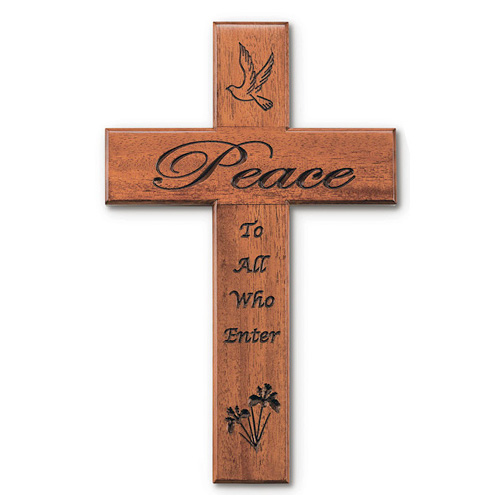 This 12 inch tall beveled edge mahogany wood wall cross has a carved message: Peace To All Who Enter.