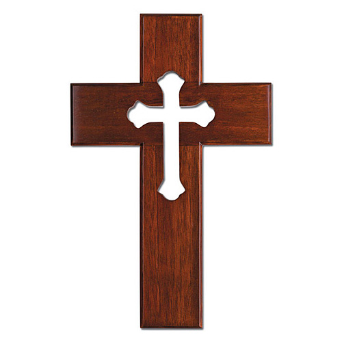 This mahogany wood wall cross has a cut-out budded cross in the center. Cross size: 6.25in x 10in. Import. Ships from USA.
