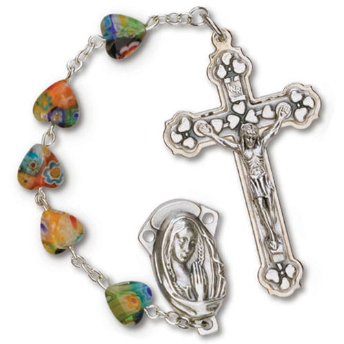 This imitation Murano glass multi-colored bead ladies' rosary is silver oxidized. Heart shaped beads measure 8mm. Features a heart Crucifix. Deluxe gift boxed. Crucifix measures 1 3/4in tall.