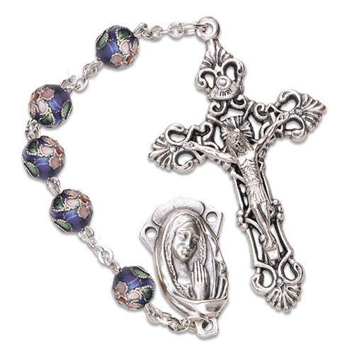 This blue cloisonne glass bead ladies' rosary is silver oxidized. Round beads measure 8mm. Features a filagree Crucifix. Deluxe gift boxed. Crucifix measures 2in tall.