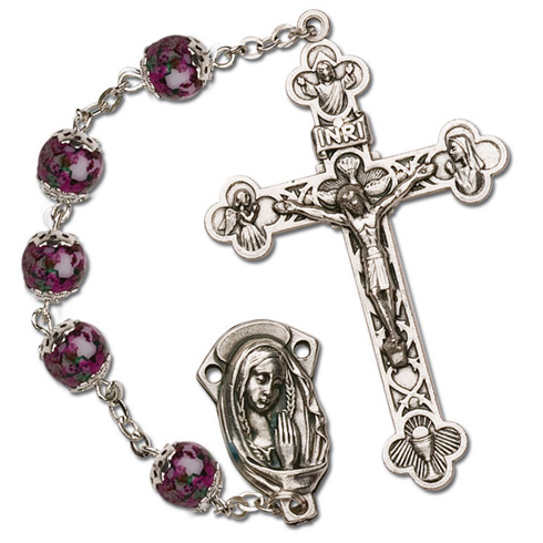 This capped imitation amethyst marble bead ladies' rosary is silver oxidized. Round beads measure 8mm. Features a budded four way Crucifix. Deluxe gift boxed. Crucifix measures 2 1/4in tall.