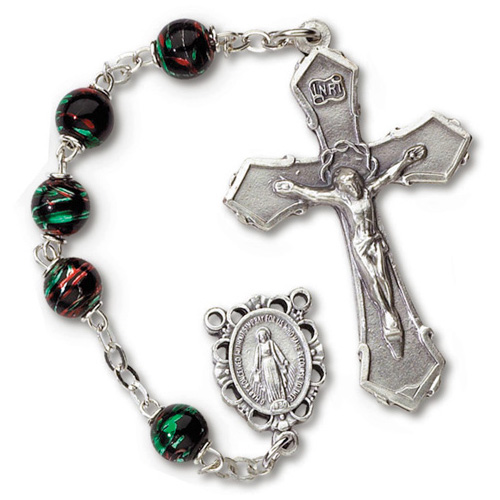 This arabesque jet bead ladies' rosary is silver oxidized. Round beads measure 7mm. Features a passion cross Crucifix. Deluxe gift boxed. Crucifix measures 1 3/4in tall.