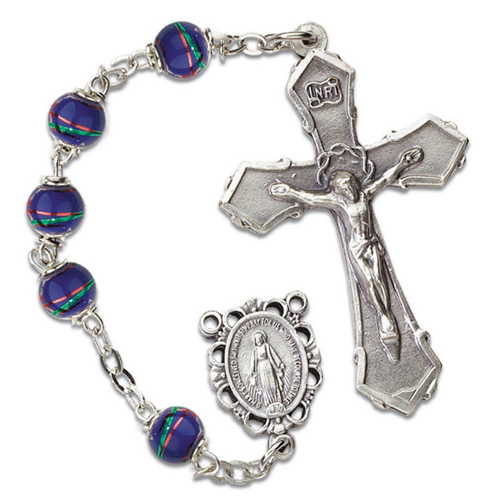This arabesque blue bead ladies' rosary is silver oxidized. Round beads measure 7mm. Features a passion cross Crucifix. Deluxe gift boxed. Crucifix measures 1 3/4in tall.