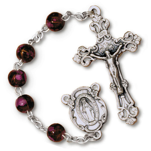 This speckled red glass bead ladies' rosary is silver oxidized. Round beads measure 6mm. Features a filigree cross Crucifix. Deluxe gift boxed. Crucifix measures 1 1/2in tall.