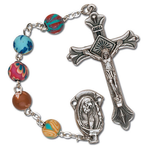 This quality ladies' rosary features multi-colored Fimo clay beads. Beads measure 7mm. Budded Crucifix is silver oxidized. Deluxe gift boxed. Crucifix measures 1 5/8in tall.