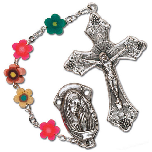 This quality ladies' rosary features multi-colored flower shaped Fimo clay beads. Beads measure 8mm. Budded floral Crucifix is silver oxidized. Deluxe gift boxed. Crucifix measures 1 7/8in tall.