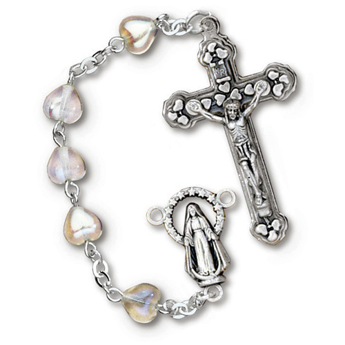 This quality ladies' rosary features heart shaped aurora borealis beads. Beads measure 6mm. Budded heart Crucifix is silver oxidized. Deluxe gift boxed. Crucifix measures 1 1/2in tall.