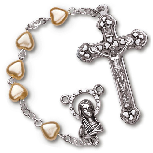 This quality ladies' rosary features heart shaped white glass pearl beads. Beads measure 6mm. Budded heart Crucifix is silver oxidized. Deluxe gift boxed. Crucifix measures 1 5/8in tall.