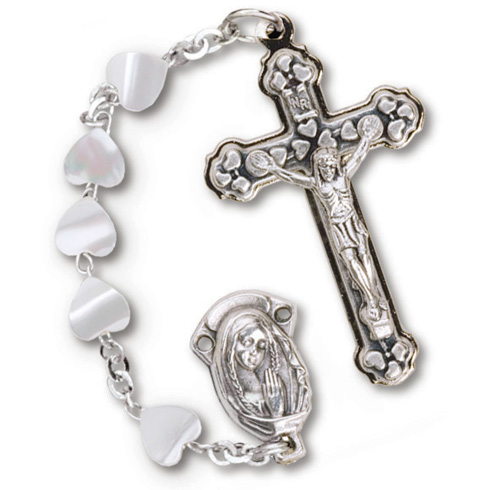 This quality ladies' rosary features heart shaped mother of pearl beads. Beads measure 6mm. Budded heart Crucifix is silver oxidized. Deluxe gift boxed. Crucifix measures 1 5/8in tall.