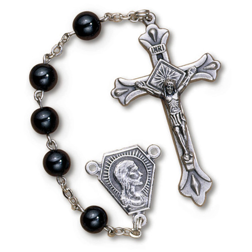 This quality ladies' rosary features genuine hermatite beads. Beads measure 6mm. Light of the world Crucifix is silver oxidized. Deluxe gift boxed. Crucifix measures 1 5/8in tall.