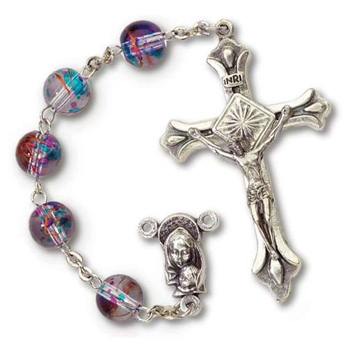 This quality ladies' rosary features multi-colored glass beads. Beads measure 7mm. Budded light of the world cross Crucifix is silver oxidized. Deluxe gift boxed. Crucifix measures 1 5/8in tall.