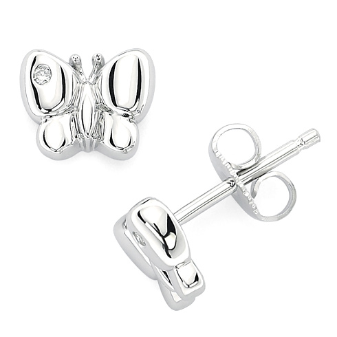 These sterling silver butterfly earrings for kids are from the Little Diva collection. They feature .02 CTW round diamond accent stones. Diamonds are H-I in color and I1-I2 in clarity. Item measures 7mm by 6mm. Weight: 0.48 g.