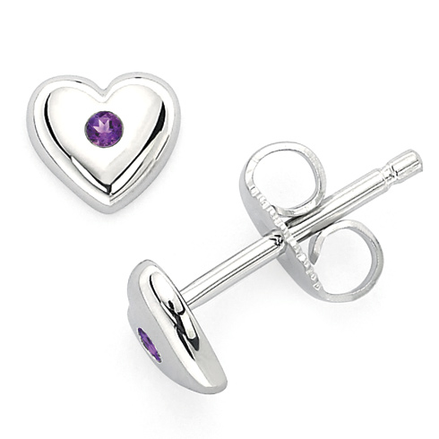 These sterling silver amethyst heart earrings for kids are from the Little Diva collection. They feature round amethyst accent stones. Item measures 6mm by 6mm. Weight: 0.63 g.