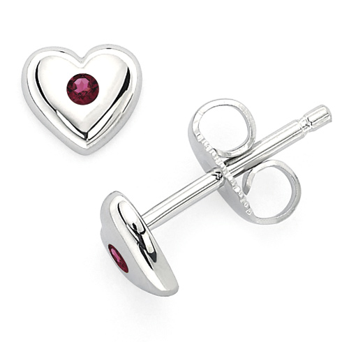 These sterling silver created ruby heart earrings for kids are from the Little Diva collection. They feature round created ruby accent stones. Item measures 6mm by 6mm. Weight: 0.63 g.