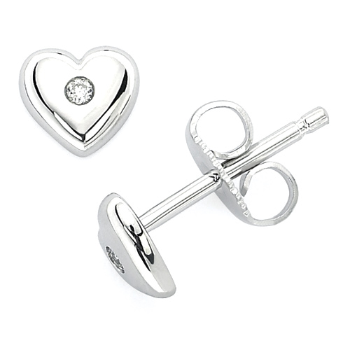 These sterling silver white sapphire heart earrings for kids are from the Little Diva collection. They feature round white sapphire accent stones. Item measures 6mm by 6mm. Weight: 0.63 g.