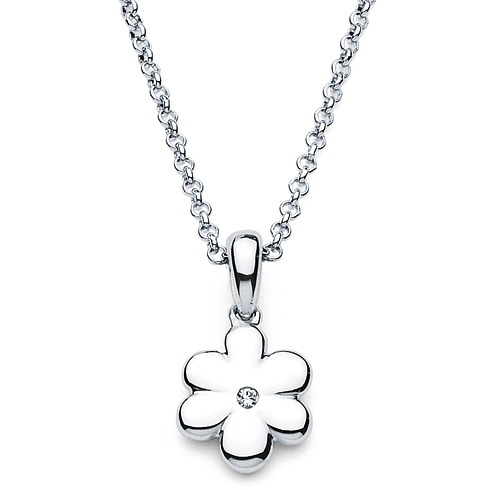 These sterling silver flower pendant for kids is from the Little Diva collection. It features a round .01 CTW diamond accent stone. The diamond is H-I in color and I1-I2 in clarity. Item measures 9mm by 9mm. Weight: 0.9 g. Pendant comes on a 16 inch, 1mm wide rolo chain with lobster clasp.