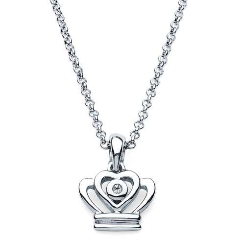 These sterling silver crown pendant for kids is from the Little Diva collection. It features a round .01 CTW diamond accent stone. The diamond is H-I in color and I1-I2 in clarity. Item measures 10mm by 9mm. Weight: 2.0 g. Pendant comes on a 16 inch, 1mm wide rolo chain with lobster clasp.