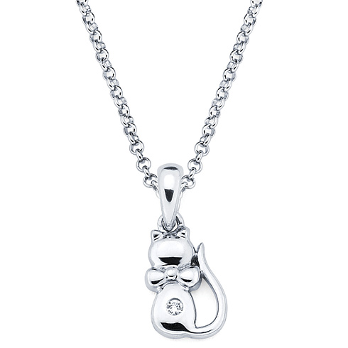 These sterling silver cat pendant for kids is from the Little Diva collection. It features a round .01 CTW diamond accent stone. The diamond is H-I in color and I1-I2 in clarity. Item measures 7mm by 11mm. Weight: 0.7 g. Pendant comes on a 16 inch, 1mm wide rolo chain with lobster clasp.