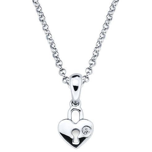 These sterling silver heart locket pendant for kids is from the Little Diva collection. It features a round .01 CTW diamond accent stone. The diamond is H-I in color and I1-I2 in clarity. Item measures 6mm by 7mm. Weight: 0.4 g. Pendant comes on a 16 inch, 1mm wide rolo chain with lobster clasp.