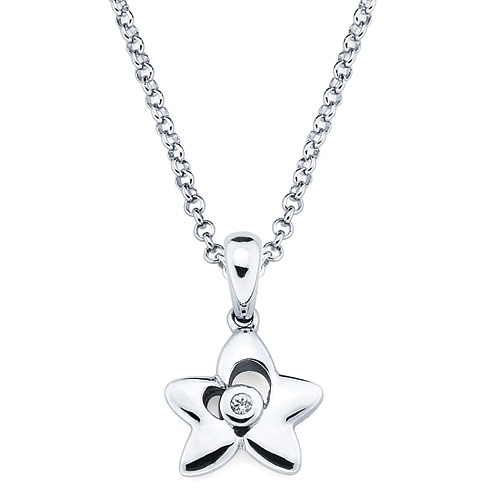 These sterling silver star pendant for kids is from the Little Diva collection. It features a round .01 CTW diamond accent stone. The diamond is H-I in color and I1-I2 in clarity. Item measures 9mm by 10mm. Weight: 0.77 g. Pendant comes on a 16 inch, 1mm wide rolo chain with lobster clasp.