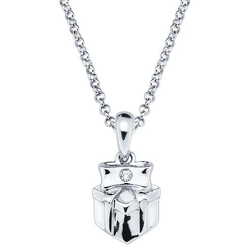 These sterling silver present pendant for kids is from the Little Diva collection. It features a round .01 CTW diamond accent stone. The diamond is H-I in color and I1-I2 in clarity. Item measures 7mm by 10mm. Weight: 0.96 g. Pendant comes on a 16 inch, 1mm wide rolo chain with lobster clasp.