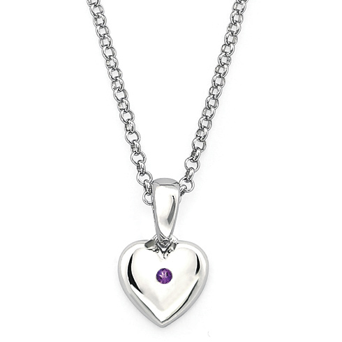 These sterling silver amethyst heart pendant for kids is from the Little Diva collection. It features a round amethyst accent stone. Item measures 7mm by 7mm. Weight: 0.71 g. Pendant comes on a 16 inch, 1mm wide rolo chain with lobster clasp.