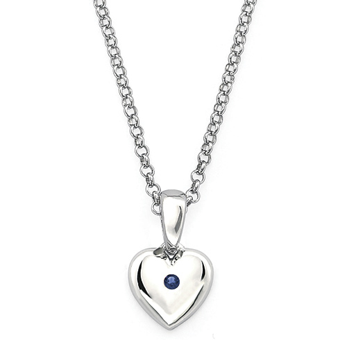 These sterling silver created sapphire heart pendant for kids is from the Little Diva collection. It features a round created sapphire accent stone. Item measures 7mm by 7mm. Weight: 0.71 g. Pendant comes on a 16 inch, 1mm wide rolo chain with lobster clasp.