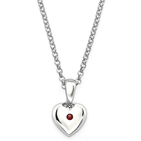 These sterling silver garnet heart pendant for kids is from the Little Diva collection. It features a round garnet accent stone. Item measures 7mm by 7mm. Weight: 0.71 g. Pendant comes on a 16 inch, 1mm wide rolo chain with lobster clasp.