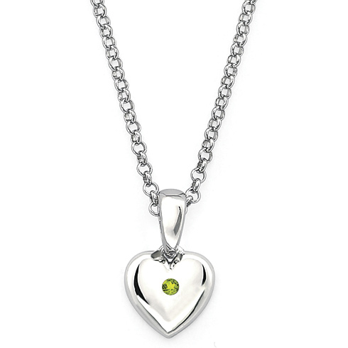 These sterling silver peridot heart pendant for kids is from the Little Diva collection. It features a round peridot accent stone. Item measures 7mm by 7mm. Weight: 0.71 g. Pendant comes on a 16 inch, 1mm wide rolo chain with lobster clasp.