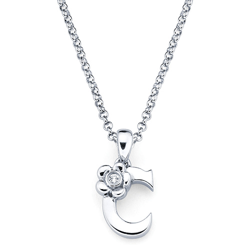 These sterling silver diamond letter C pendant for kids is from the Little Diva collection. It features a round .01 CTW diamond accent stone. The diamond is H-I in color and I1-I2 in clarity. Item measures 6mm by 9mm. Weight: 0.7 g. Pendant comes on a 16 inch, 1mm wide rolo chain with lobster clasp.
