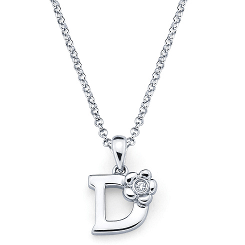 These sterling silver diamond letter D pendant for kids is from the Little Diva collection. It features a round .01 CTW diamond accent stone. The diamond is H-I in color and I1-I2 in clarity. Item measures 9mm by 8mm. Weight: 0.94 g. Pendant comes on a 16 inch, 1mm wide rolo chain with lobster clasp.