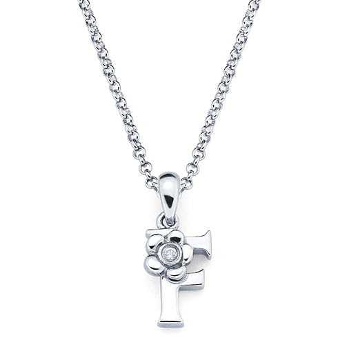 These sterling silver diamond letter F pendant for kids is from the Little Diva collection. It features a round .01 CTW diamond accent stone. The diamond is H-I in color and I1-I2 in clarity. Item measures 7mm by 10mm. Weight: 0.67 g. Pendant comes on a 16 inch, 1mm wide rolo chain with lobster clasp.