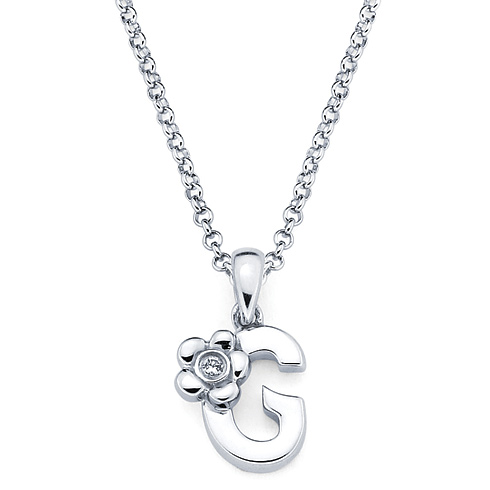 These sterling silver diamond letter G pendant for kids is from the Little Diva collection. It features a round .01 CTW diamond accent stone. The diamond is H-I in color and I1-I2 in clarity. Item measures 10mm by 11mm. Weight: 0.78 g. Pendant comes on a 16 inch, 1mm wide rolo chain with lobster clasp.