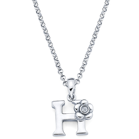 These sterling silver diamond letter H pendant for kids is from the Little Diva collection. It features a round .01 CTW diamond accent stone. The diamond is H-I in color and I1-I2 in clarity. Item measures 8mm by 8mm. Weight: 2.18 g. Pendant comes on a 16 inch, 1mm wide rolo chain with lobster clasp.