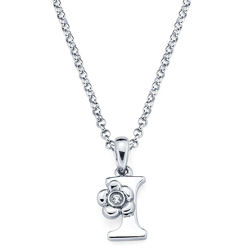 These sterling silver diamond letter I pendant for kids is from the Little Diva collection. It features a round .01 CTW diamond accent stone. The diamond is H-I in color and I1-I2 in clarity. Item measures 5mm by 8mm. Weight: 0.69 g. Pendant comes on a 16 inch, 1mm wide rolo chain with lobster clasp.