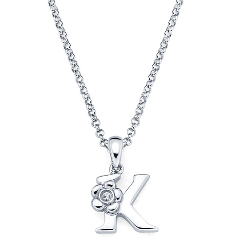 These sterling silver diamond letter K pendant for kids is from the Little Diva collection. It features a round .01 CTW diamond accent stone. The diamond is H-I in color and I1-I2 in clarity. Item measures 9mm by 8mm. Weight: 0.89 g. Pendant comes on a 16 inch, 1mm wide rolo chain with lobster clasp.