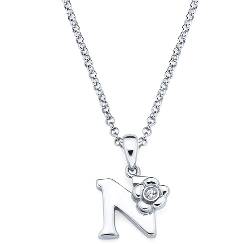 These sterling silver diamond letter N pendant for kids is from the Little Diva collection. It features a round .01 CTW diamond accent stone. The diamond is H-I in color and I1-I2 in clarity. Item measures 8mm by 8mm. Weight: 0.99 g. Pendant comes on a 16 inch, 1mm wide rolo chain with lobster clasp.