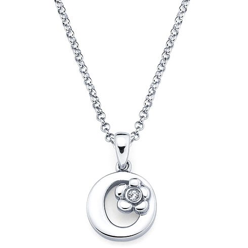 These sterling silver diamond letter O pendant for kids is from the Little Diva collection. It features a round .01 CTW diamond accent stone. The diamond is H-I in color and I1-I2 in clarity. Item measures 9mm by 9mm. Weight: 1.00 g. Pendant comes on a 16 inch, 1mm wide rolo chain with lobster clasp.