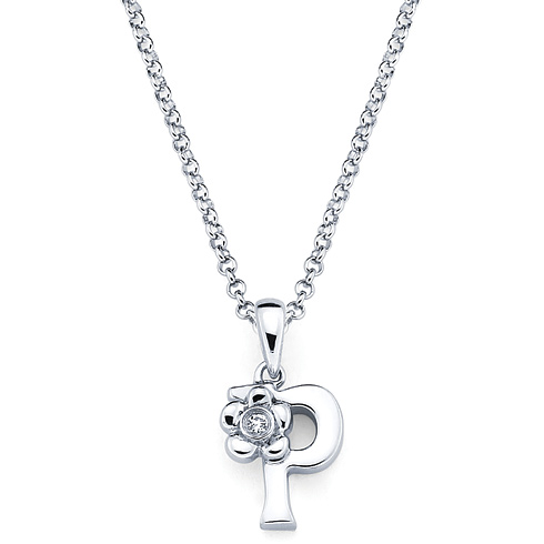 These sterling silver diamond letter P pendant for kids is from the Little Diva collection. It features a round .01 CTW diamond accent stone. The diamond is H-I in color and I1-I2 in clarity. Item measures 8mm by 11mm. Weight: 0.75 g. Pendant comes on a 16 inch, 1mm wide rolo chain with lobster clasp.
