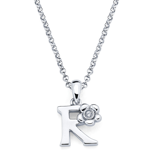 These sterling silver diamond letter R pendant for kids is from the Little Diva collection. It features a round .01 CTW diamond accent stone. The diamond is H-I in color and I1-I2 in clarity. Item measures 8mm by 8mm. Weight: 0.83 g. Pendant comes on a 16 inch, 1mm wide rolo chain with lobster clasp.