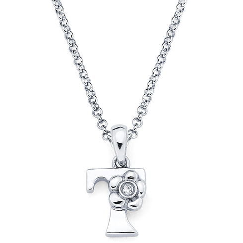 These sterling silver diamond letter T pendant for kids is from the Little Diva collection. It features a round .01 CTW diamond accent stone. The diamond is H-I in color and I1-I2 in clarity. Item measures 7mm by 8mm. Weight: 0.75 g. Pendant comes on a 16 inch, 1mm wide rolo chain with lobster clasp.