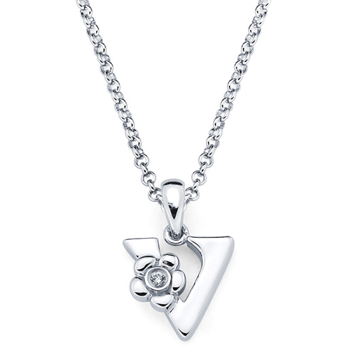 These sterling silver diamond letter V pendant for kids is from the Little Diva collection. It features a round .01 CTW diamond accent stone. The diamond is H-I in color and I1-I2 in clarity. Item measures 9mm by 10mm. Weight: 0.78 g. Pendant comes on a 16 inch, 1mm wide rolo chain with lobster clasp.