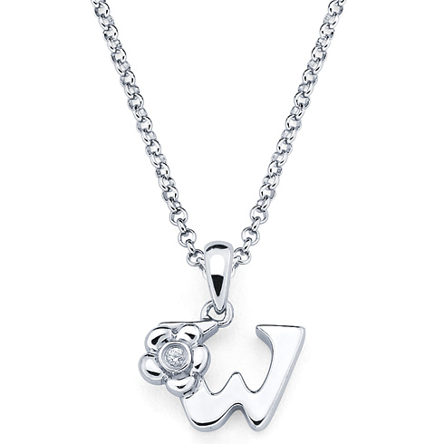 These sterling silver diamond letter W pendant for kids is from the Little Diva collection. It features a round .01 CTW diamond accent stone. The diamond is H-I in color and I1-I2 in clarity. Item measures 12mm by 8mm. Weight: 0.9 g. Pendant comes on a 16 inch, 1mm wide rolo chain with lobster clasp.