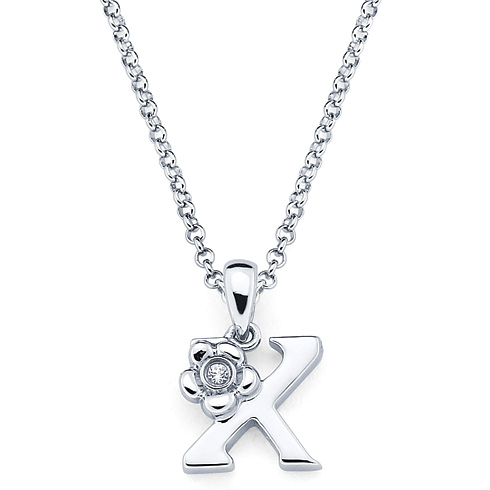 These sterling silver diamond letter X pendant for kids is from the Little Diva collection. It features a round .01 CTW diamond accent stone. The diamond is H-I in color and I1-I2 in clarity. Item measures 9mm by 8mm. Weight: 0.83 g. Pendant comes on a 16 inch, 1mm wide rolo chain with lobster clasp.