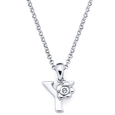These sterling silver diamond letter Y pendant for kids is from the Little Diva collection. It features a round .01 CTW diamond accent stone. The diamond is H-I in color and I1-I2 in clarity. Item measures 8mm by 9mm. Weight: 0.64 g. Pendant comes on a 16 inch, 1mm wide rolo chain with lobster clasp.