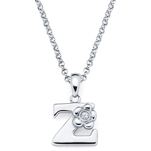These sterling silver diamond letter Z pendant for kids is from the Little Diva collection. It features a round .01 CTW diamond accent stone. The diamond is H-I in color and I1-I2 in clarity. Item measures 9mm by 8mm. Weight: 1.02 g. Pendant comes on a 16 inch, 1mm wide rolo chain with lobster clasp.