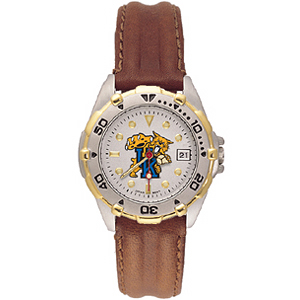 University of Kentucky ladies' all star leather watch has a brushed chrome finish case with a rotating two-tone bezel. The All-Star features a precision Miyota® quartz movement, distinguished dial face, with the team logo on the top half and team name on lower half of dial, date window, raised luminous hour, minute and second hands, and the crystal is mineral glass. Water resistant. Packaged in an attractive silver tin. Two year limited warranty.