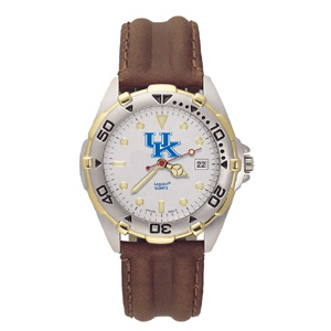 The men's University of Kentucky all star watch has a brushed chrome finish case with a rotating two-tone bezel and brown leather strap. The All-Star features a precision Miyota® quartz movement. Round dial has the school logo on the top half, with date window, raised luminous hour, minute and second hands, and the crystal is mineral glass. Water resistant. Packaged in an attractive silver tin. Two year limited warranty.